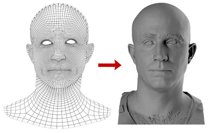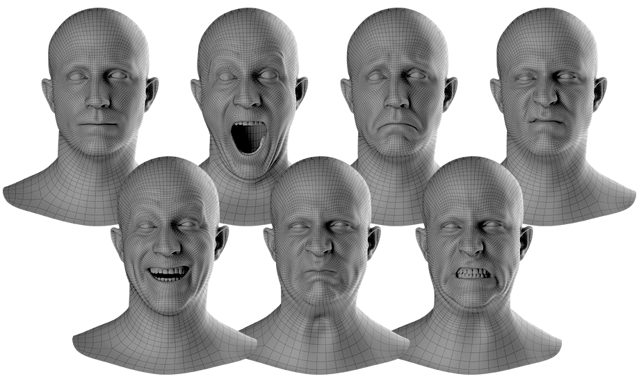 The neutral scan is supplied by CAS to the client VFX team for wrapping with their preferred base mesh. This defines the topology and UVs, and provides the internal eyeball and teeth geometry.