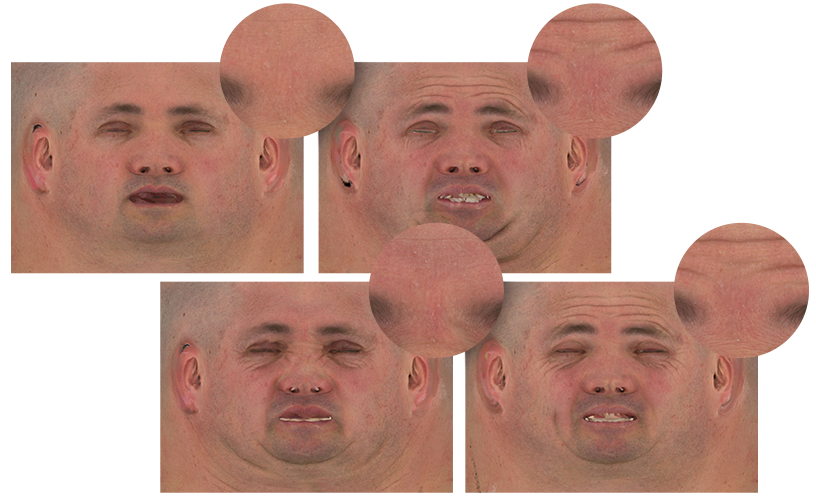 TopoTrack assets have extremely stable and consistent UVs which transition seamlessly across all FACS shapes. Each TopoTrack 3D delivery comes with diffuse maps as standard.